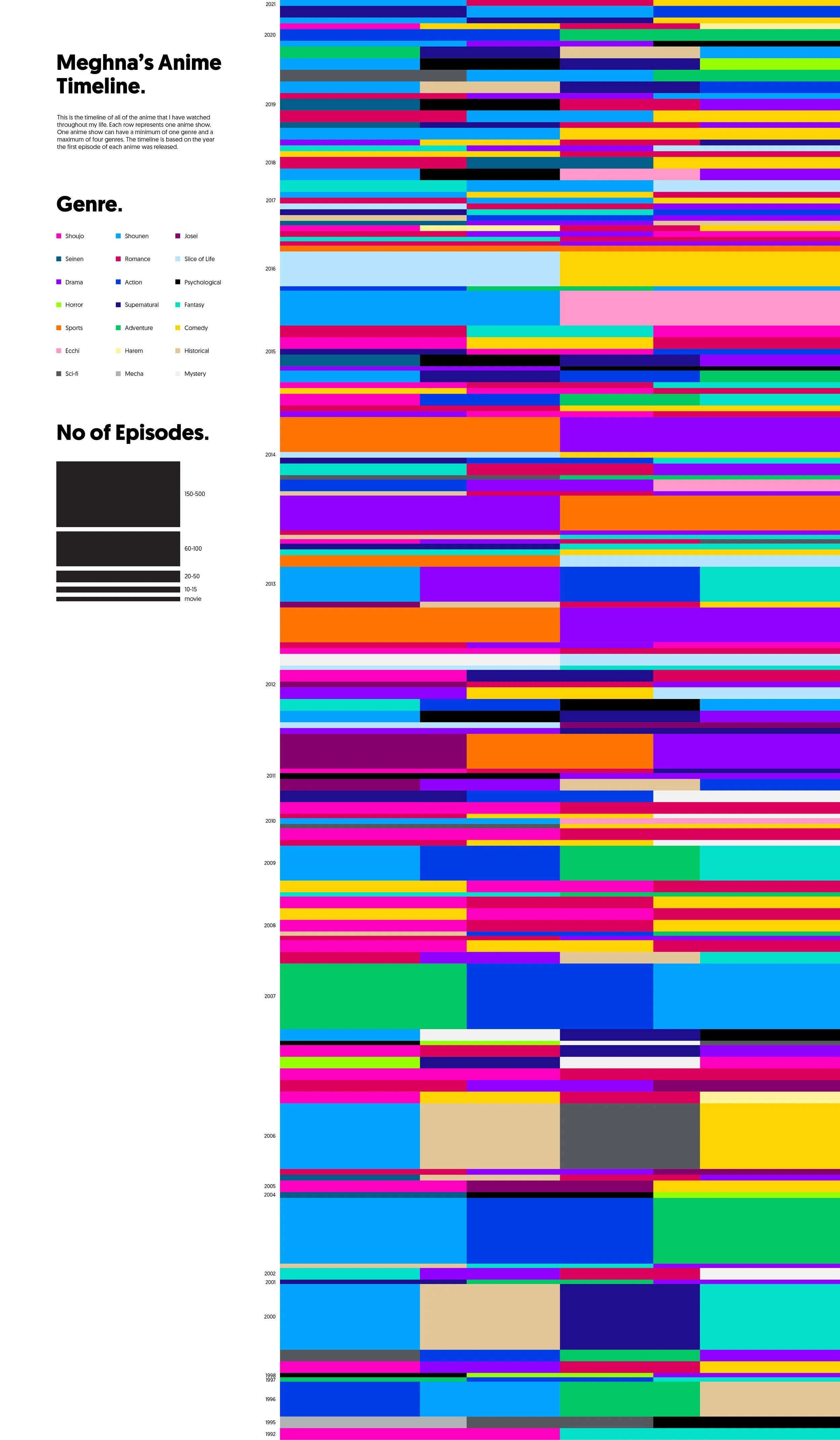 I realized I needed a large amount of data based on a timeline to implement rock layers as a method for data visualization. I have a practice of recording all the anime I have watched in a list. There is a total of 120 shows that I have recorded so far that range through genres in a linear timeline. This works perfectly with using the visualization of rock layers as each layer will present a history.